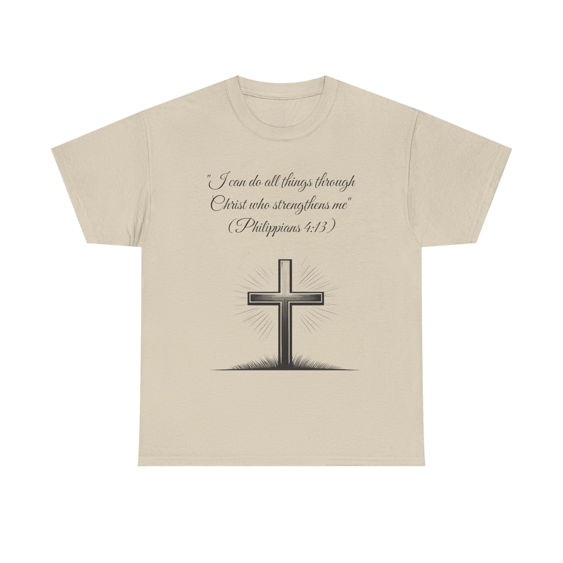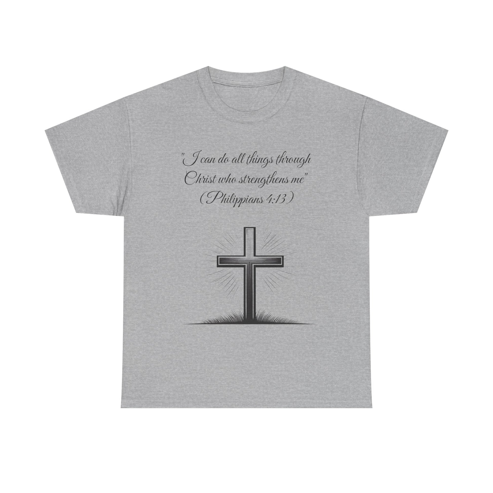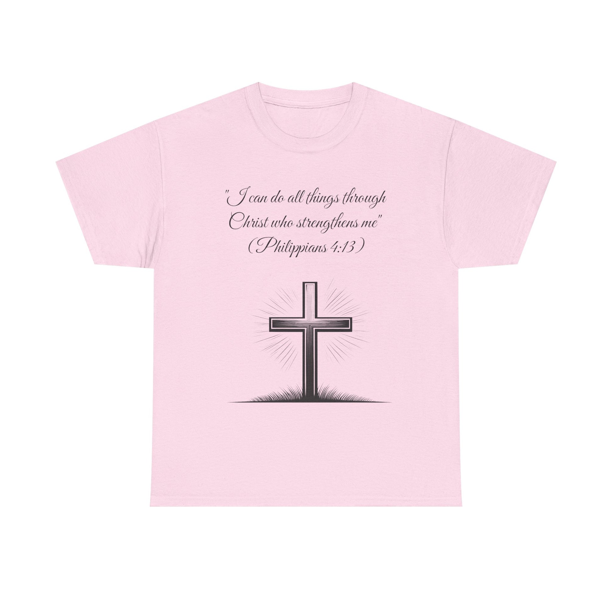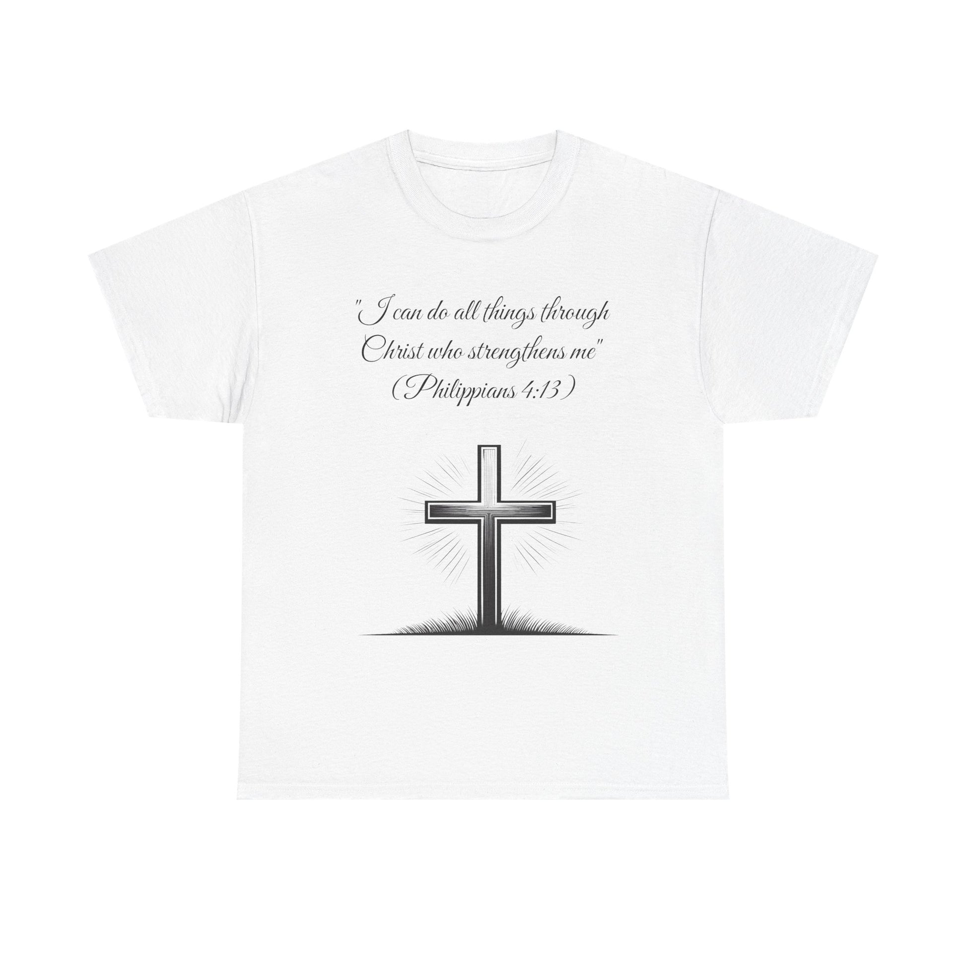 Discover comfort and inspiration with this unisex heavy cotton T-shirt. Its classic fit and crew neckline offer a relaxed, versatile look for everyday wear, church gatherings, or faith-based events. Featuring the uplifting "I can do all things through Christ who strengthens me" (Philippians 4:13) quote with a striking cross design, this tee blends style and spirituality. Ideal as a gift for Easter, Christmas, or any occasion, it’s crafted from soft, durable fabric. Perfect for expressing your faith—shop now!