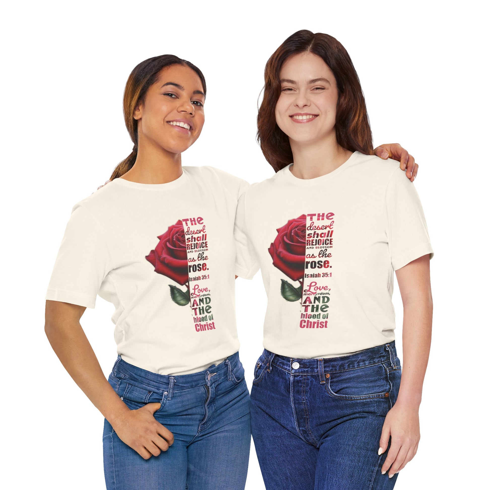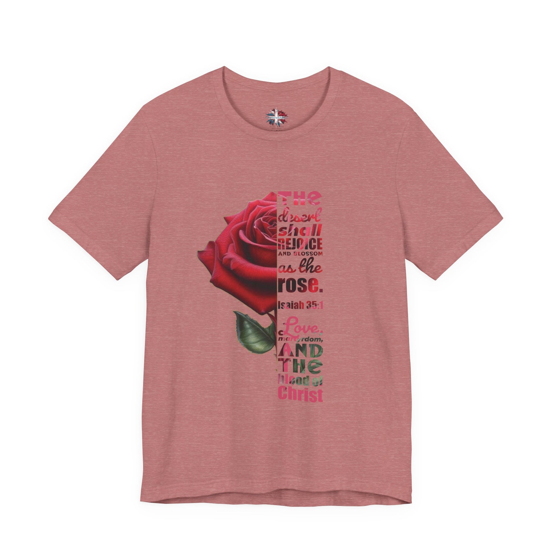 Discover the power of renewal with the Desert Bloom Women's T-Shirt—a striking design featuring a vibrant red rose emerging from arid ground, inspired by the timeless words: 'The desert shall rejoice and blossom as the rose' (Isaiah 35:1). This tee celebrates transformation, inner strength, and the beauty that arises from challenges, making it an uplifting choice for everyday wear.