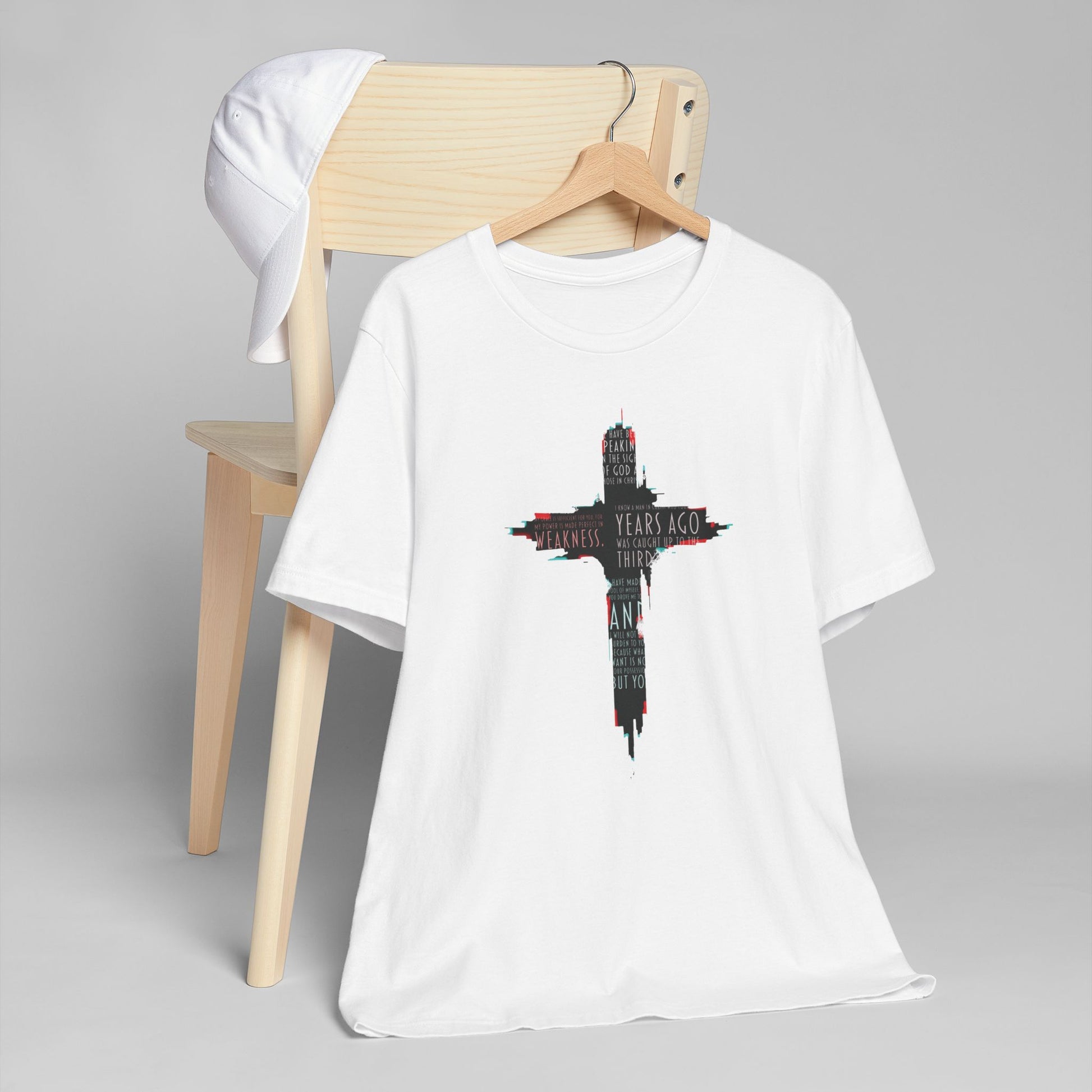 Glitched Cross Christian T-Shirt | Minimalist Bible Verse Grace Tee | Edgy Cyber Faith Streetwear | 2 Corinthians 12:9 Glitch Art