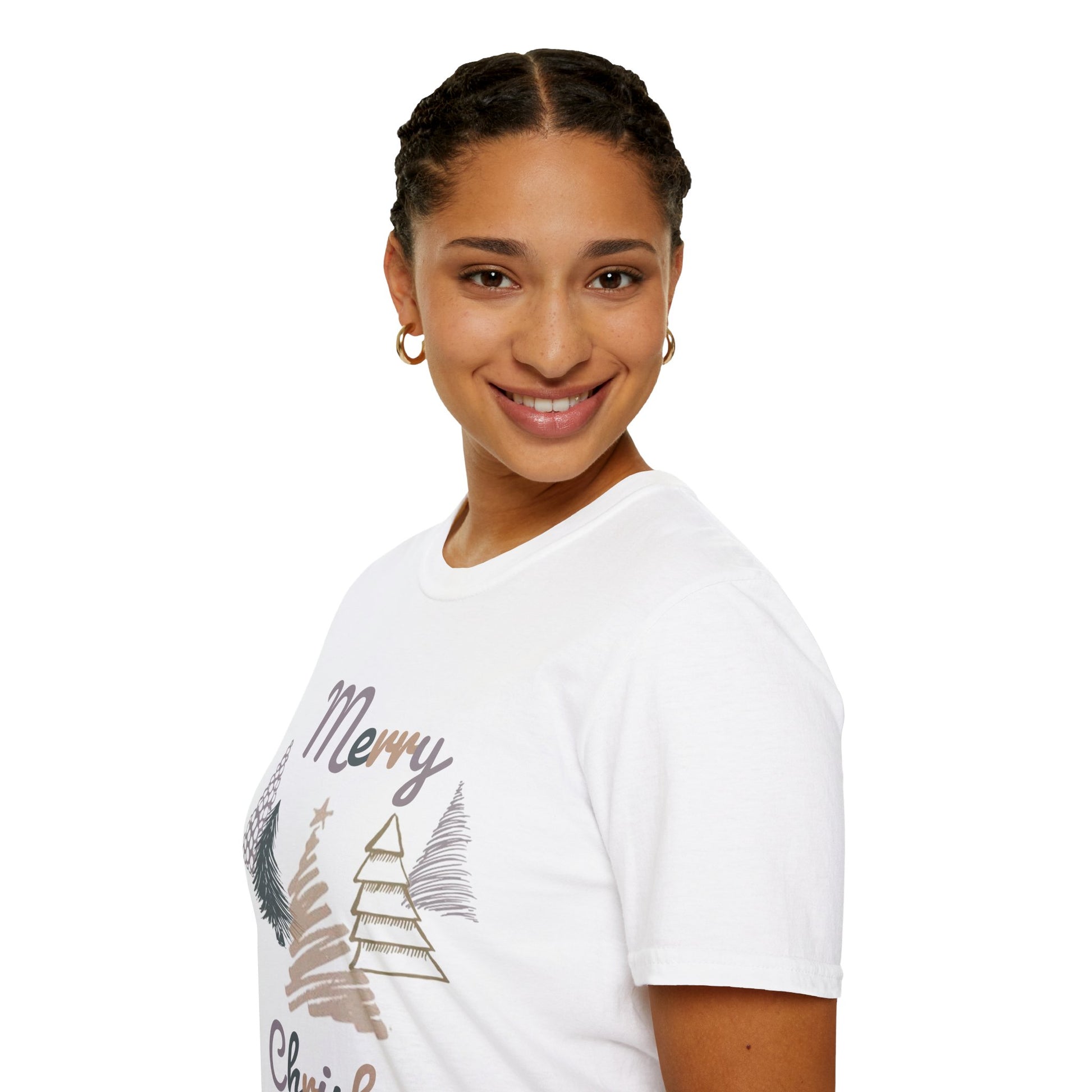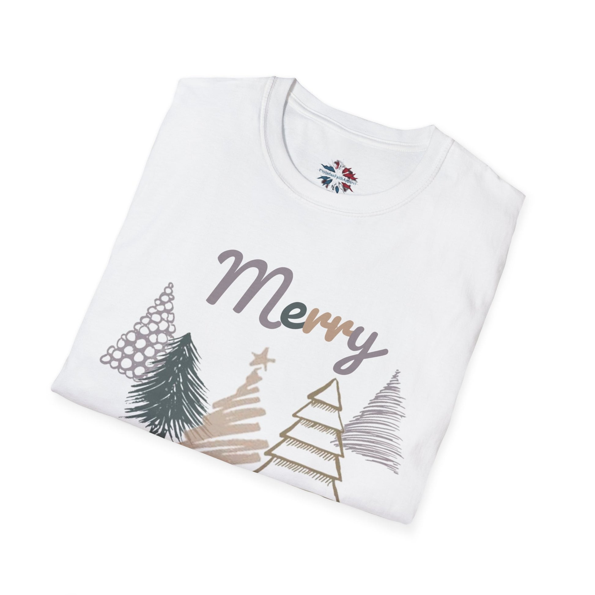 Embrace understated holiday magic with this boho-inspired "Merry Christmas" T-shirt. Delicate mauve script dances alongside a forest of hand-drawn trees—dotted evergreens, brush-stroke pines, and gold-accented outlines—for a serene, artistic glow. Soft, breathable Bella+Canvas cotton in unisex sizing (S-2XL) makes it ideal for cozy gatherings, gift wrapping under the tree, or layering with denim. Neutral tones for everyday wear that whispers joy, not shouts. Perfect for the free-spirited celebrant seeking subtle festivity. #BohoChristmas #MinimalistHoliday